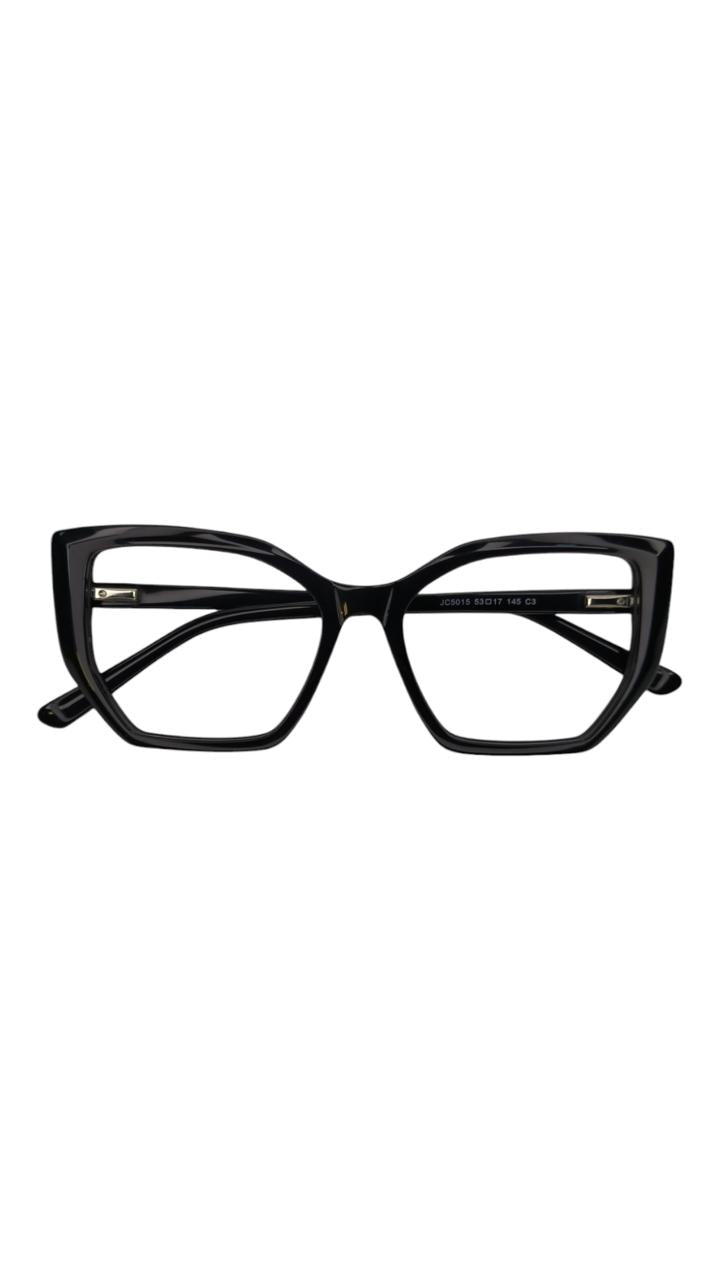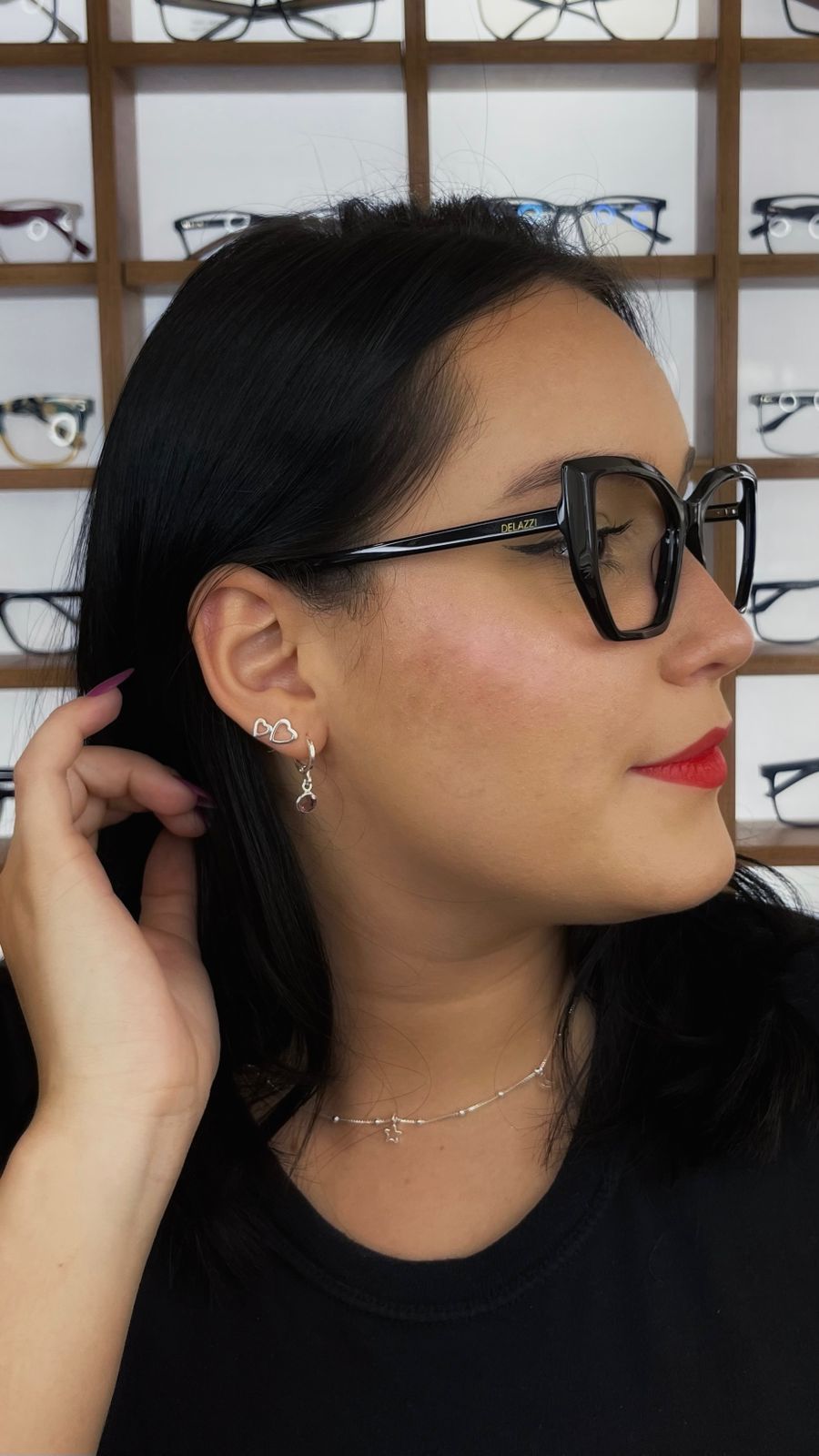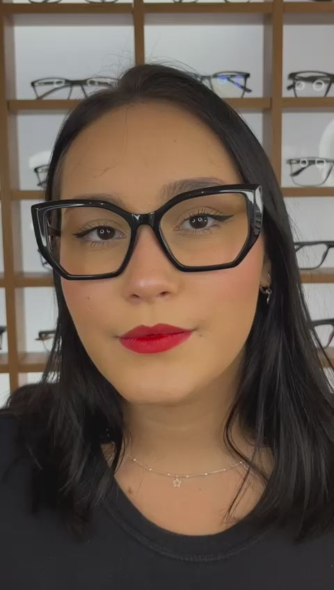 A armação Gabi apresenta um design gatinho angulado em acetato preto, unindo modernidade e elegância. Seu formato ousado realça o olhar, oferecendo um estilo sofisticado e cheio de personalidade.